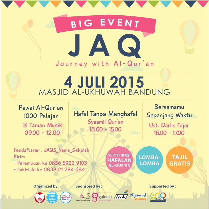 Acaranya : 🎋Pawai Al Quran 1000 pelajar ! 🎋Menghafal tanpa menghafal – syaamil Quran 🎋Bersamamu Sepanjang waktu – Ust. Darlis Fajar 🎋Lomba-lomba tingkat Kota Bandung 🎋Buka Puasa GRATIS !