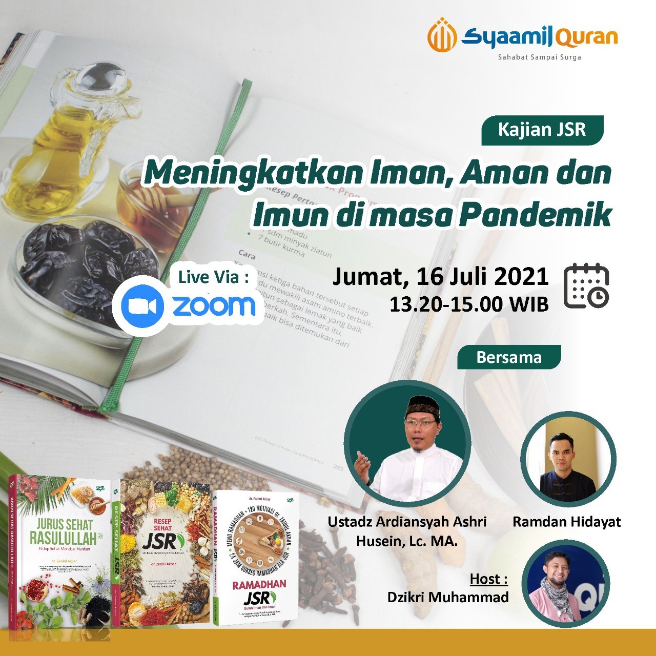 Alhamdulillah pada hari Jumat 16 Juli 2021. Syaamil Quran menghadirkan kajian JSR khusus Mitra Syaamil, dengan tema Meningkatkan Iman, Aman dan Imun di masa Pandemik.