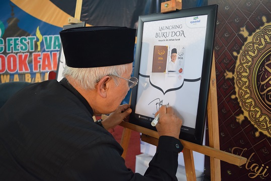 Di penghujung acara, Bapak Dr. KH Miftah Faridl beserta bapak Arifin Purnomo selaku Direktur Syaamil Quran meresmikan launching buku doa dan Al-Quran Haji Umroh.